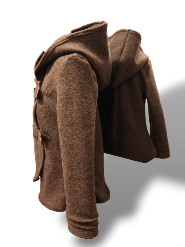 Maßangefertigte Walkjacke in warmen Brauntönen mit Kapuze und Kokosnussknöpfen – Handarbeit von KaliMa Design