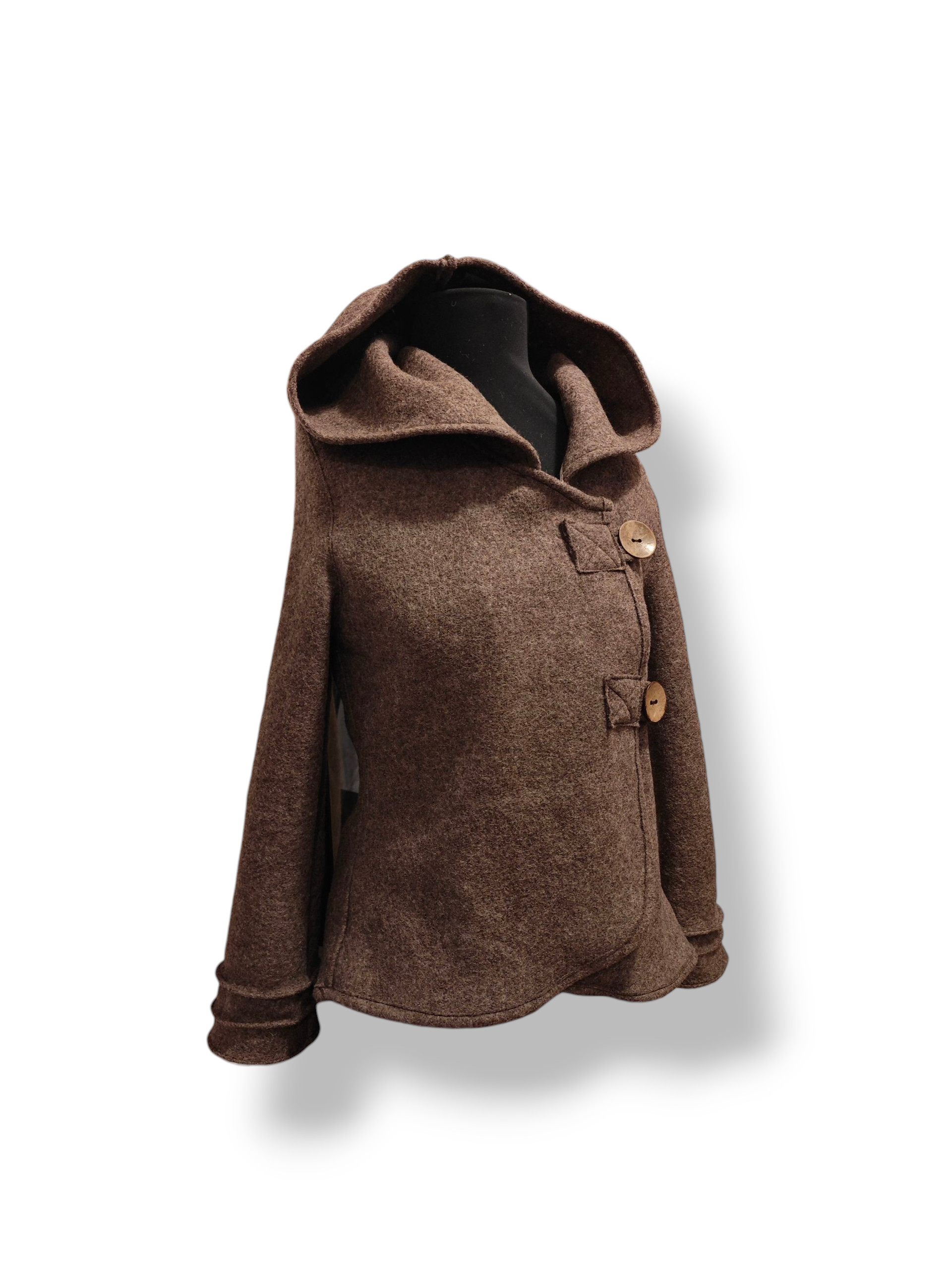 Maßangefertigte Walkjacke in warmen Brauntönen mit Kapuze und Kokosnussknöpfen – Handarbeit von KaliMa Design