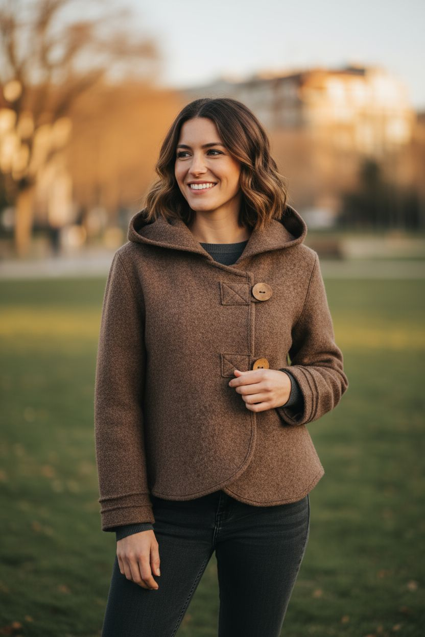 Maßgefertigte Walkjacke in Brauntönen mit Kapuze & Kokosnussknöpfen – Handmade von KaliMa Design